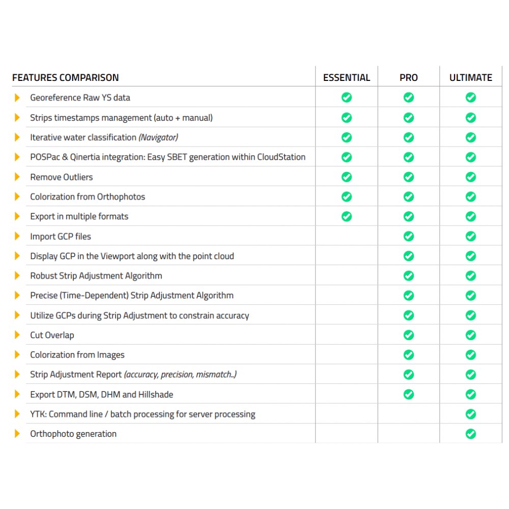 CloudStation är YellowScans egenutvecklade programvara för behandling av LiDAR och bild-data från YellowScans sensorer. Här kan du producera punkmoln, höjdmodeller, konturlinjer och ortofoton i ett lättnavigerat arbetsflöde.